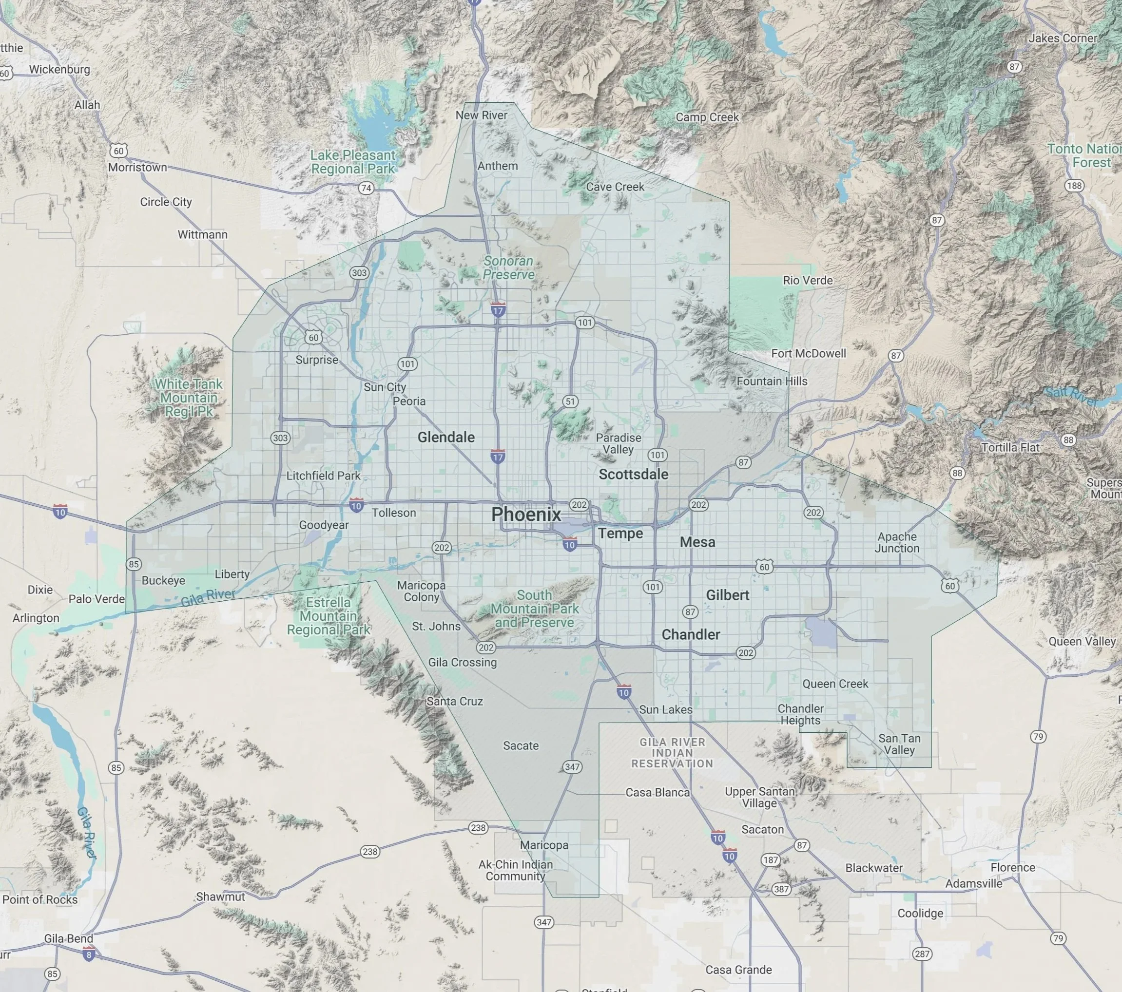 The general areas we serve are shown. Service availability for a particular location may vary and is not guaranteed.